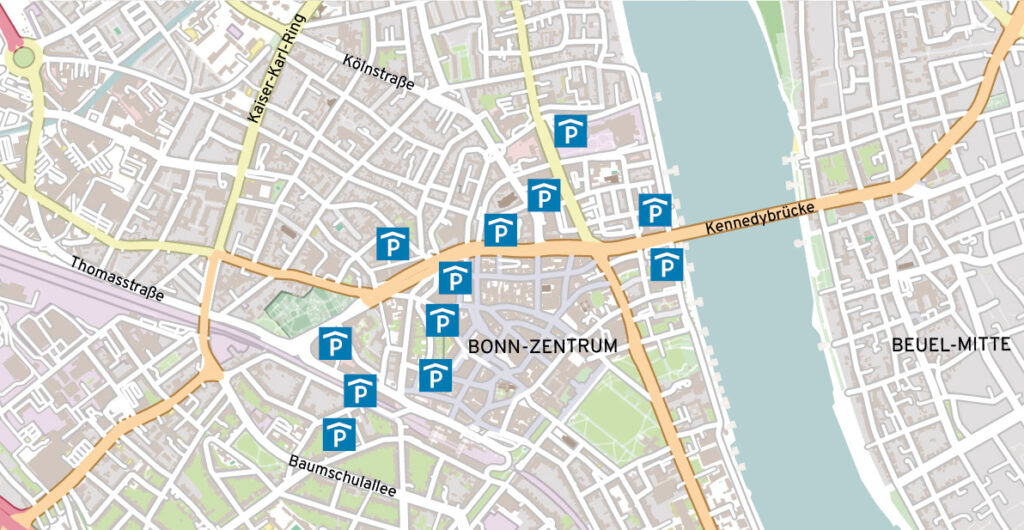 Das Parkleitsystem führt Sie gezielt zu den Parkhäusern mit den meisten freien Stellplätzen. Allein in Parkhäusern und Tiefgaragen stehen in der Bonner Innenstadt rund 4000 Stellplätze zur Verfügung. Nur selten sind alle Parkhäuser gleichzeitig voll ausgelastet. Bei besonderen Anlässen, wie etwa großen Festen, empfehlen wir die etwas weniger zentralen Parkhäuser. Zum Beispiel das Beethoven-, Opern- oder LVR-LandesMuseum Parkhaus, aber auch das B+B-Parkhaus an der Bundeskunsthalle und das Parkhaus am Kongresszentrum (WCCB) bieten häufig noch freie Plätze. Die Preise für die Parkhäuser bleiben seit Jahren auf ähnlichem Niveau. Auch ohne eigenes Auto können schwere Einkäufe transportiert werden, z. B. mithilfe von Carsharing oder Miet- Lastenrädern.