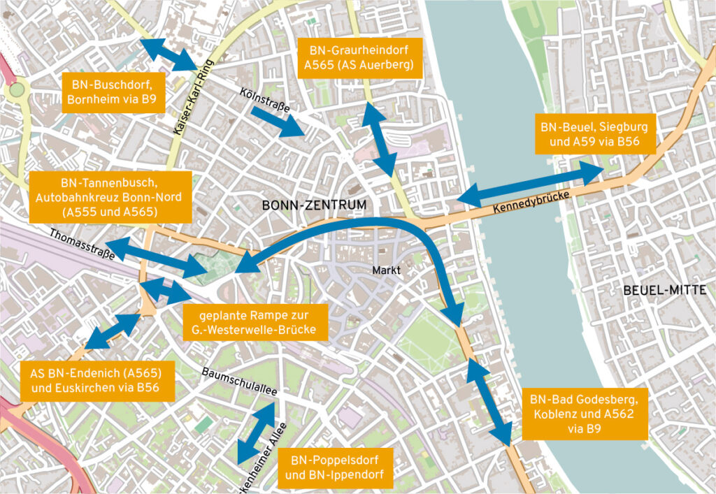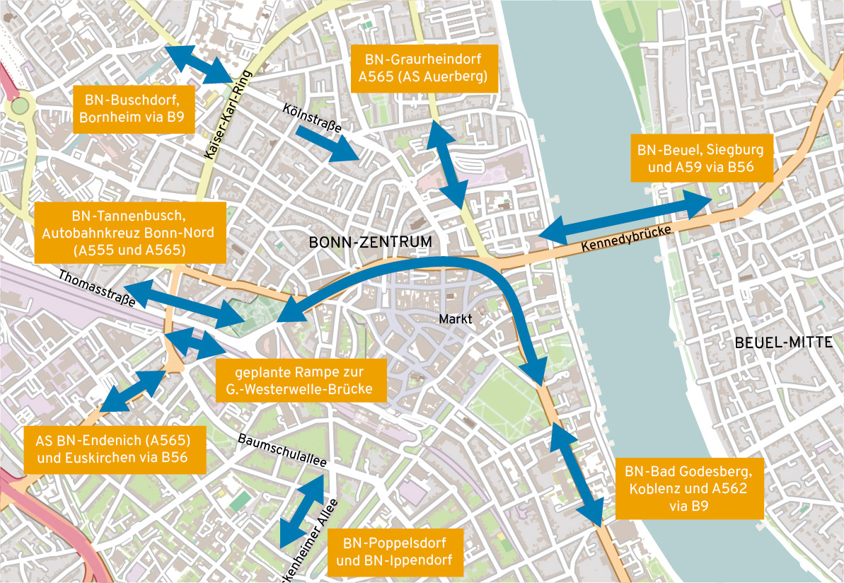 - Ost-West-Achse: wichtige Querverbindung, verläuft über die B 56 und die Kennedybrücke